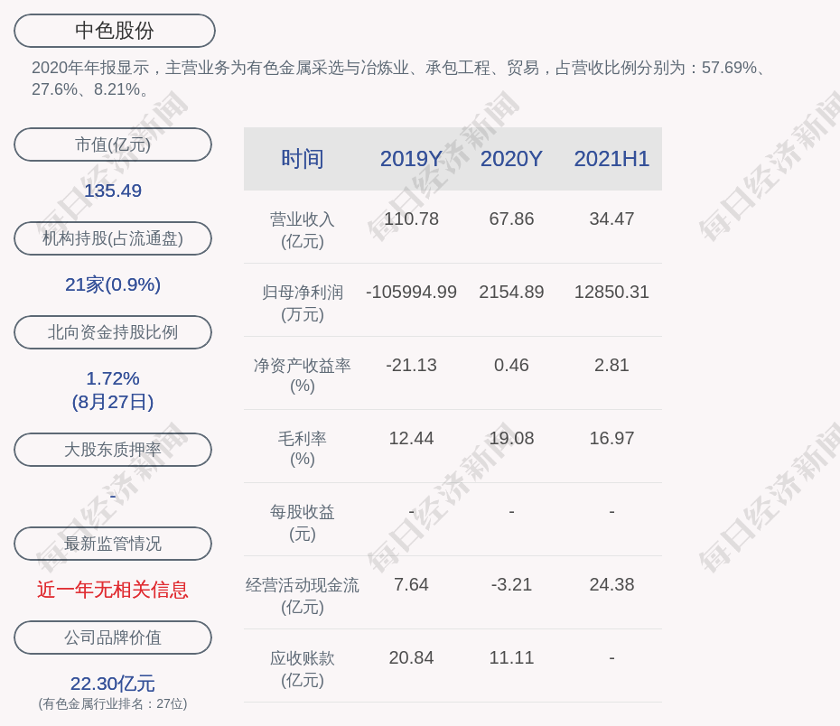 2020年年報(bào)顯示,中色股份的主營(yíng)業(yè)務(wù)為有色金屬采選與冶煉業(yè)、承包工程、貿(mào)易,占營(yíng)收比例分別為:57.69%、27.6%、8.21%。