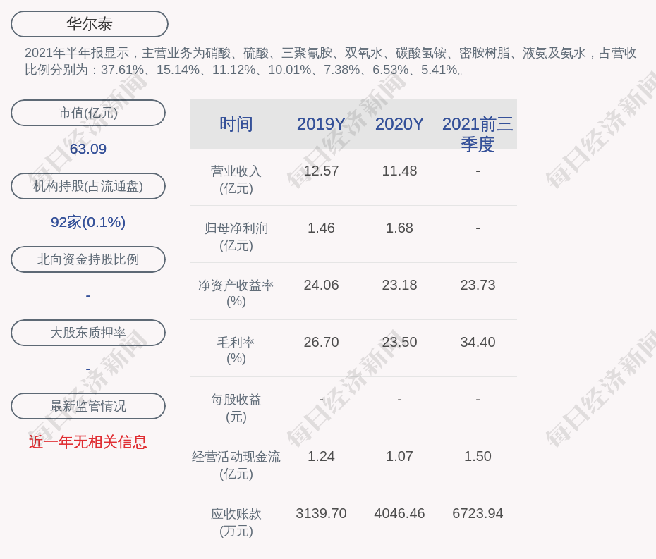 2021年半年報(bào)顯示,華爾泰的主營(yíng)業(yè)務(wù)為硝酸、硫酸、三聚氰胺、雙氧水、碳酸氫銨、密胺樹(shù)脂、液氨及氨水,占營(yíng)收比例分別為:37.61%、15.14%、11.12%、10.01%、7.38%、6.53%、5.41%。