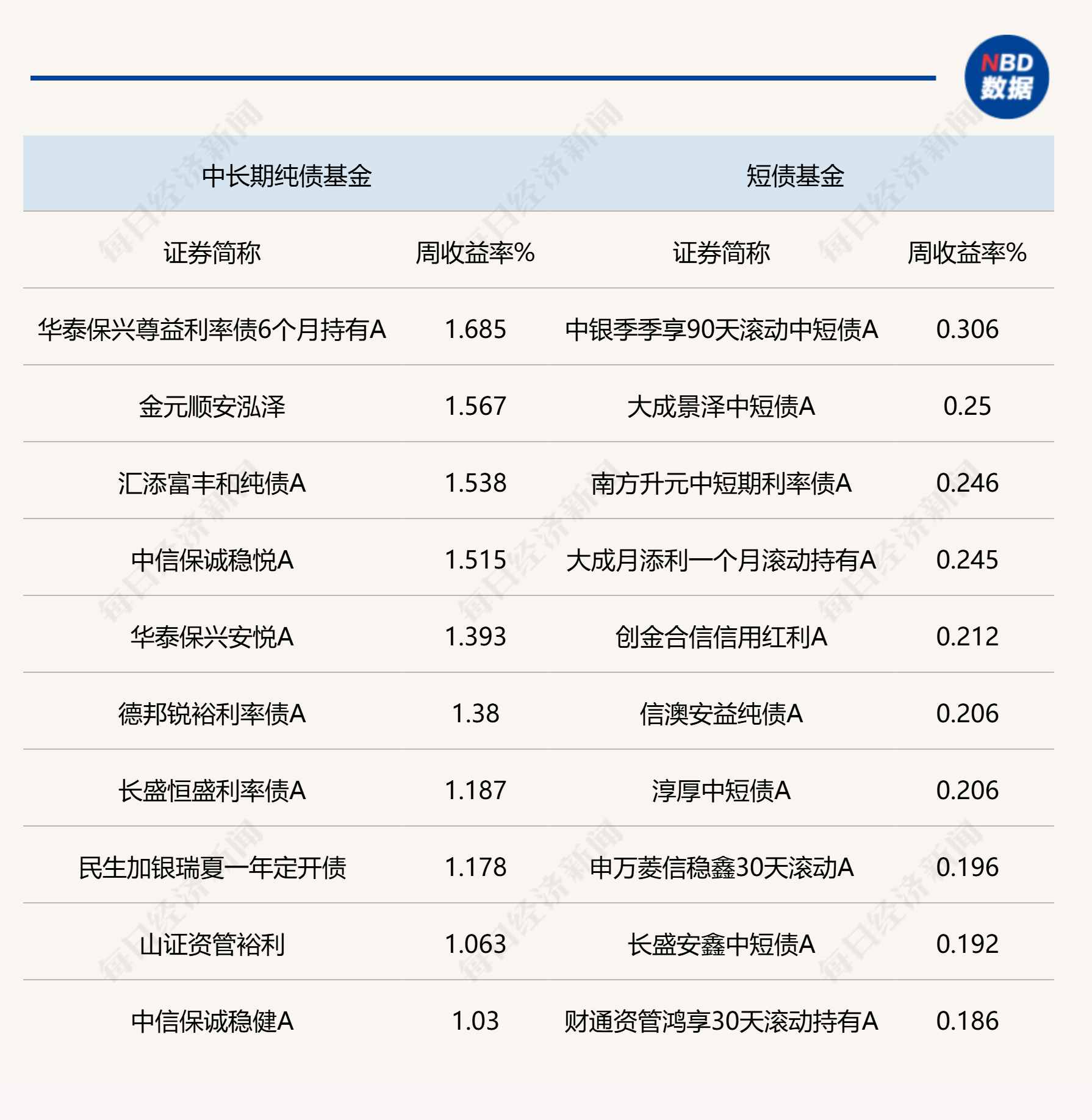頭部業(yè)績(jī)產(chǎn)品的統(tǒng)計(jì)當(dāng)中,華泰保興尊益利率債6個(gè)月A上周上漲1.68%,是純債基金當(dāng)中業(yè)績(jī)最好的一只,總體統(tǒng)計(jì)顯示,有10只純債基金的單周業(yè)績(jī)?cè)?%以上。這樣的單只基金周收益統(tǒng)計(jì)情況在過去數(shù)周很少出現(xiàn)。