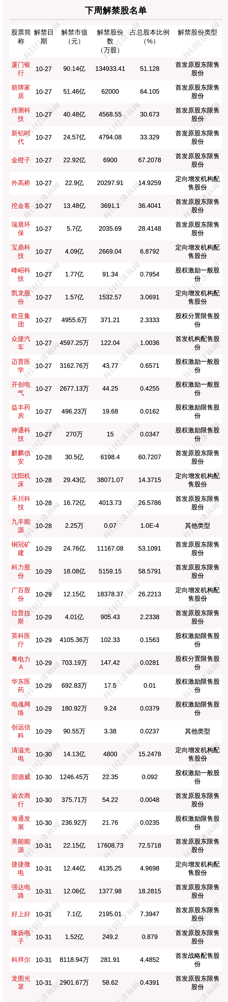 具體到個(gè)股,下周解禁市值排名前3的是廈門銀行、箭牌家居、偉測科技,解禁市值分別為90.14億元、51.46億元、40.48億元。