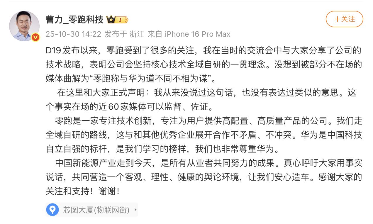 10月30日,針對(duì)“零跑稱與華為道不同不相為謀”的說(shuō)法,零跑汽車高級(jí)副總裁曹力在社交平臺(tái)發(fā)布聲明稱,從來(lái)沒(méi)說(shuō)過(guò)這句話,也沒(méi)有表達(dá)過(guò)類似的意思。