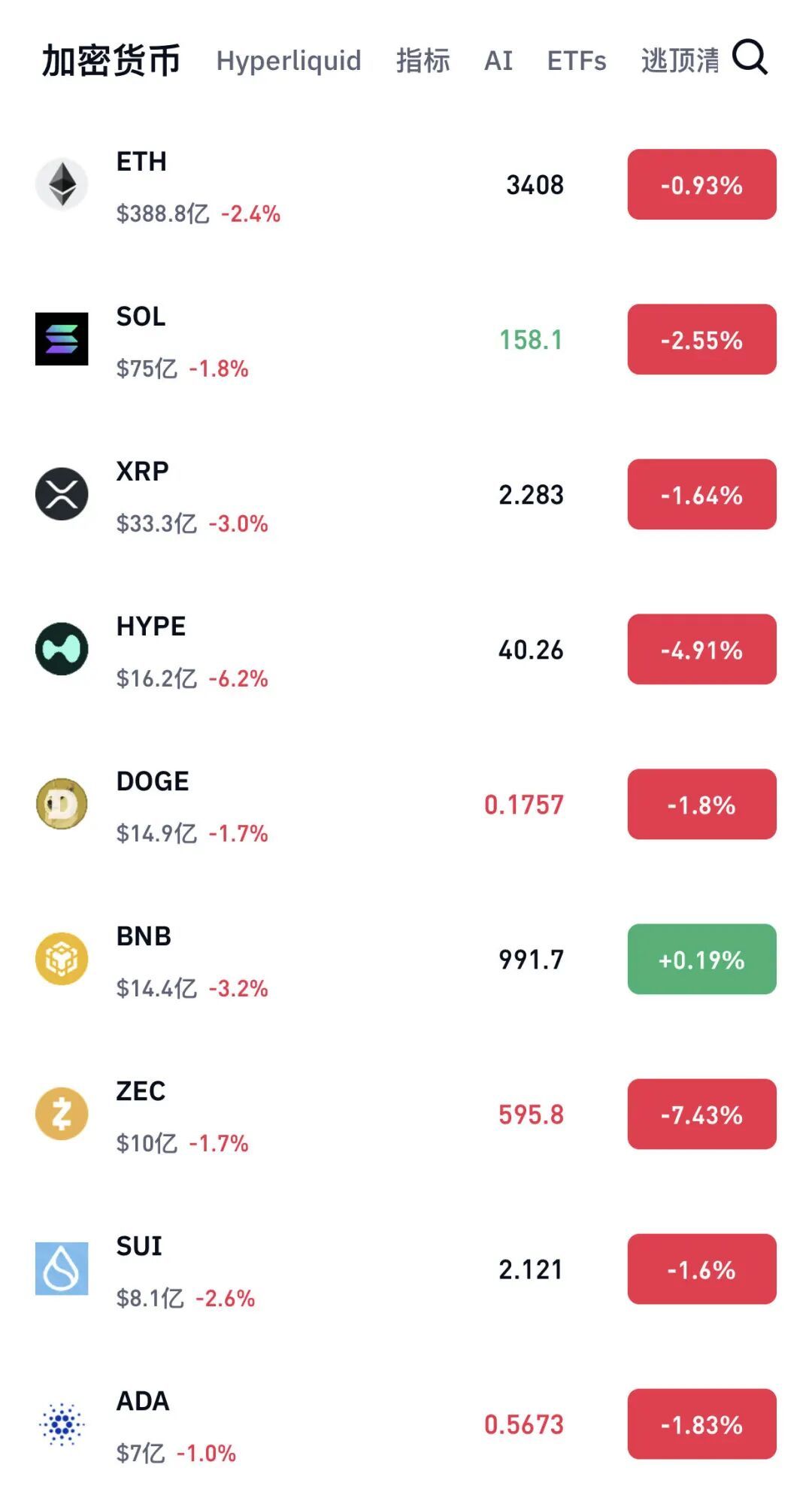 其他虛擬貨幣大多數(shù)復(fù)刻這種走勢,截至發(fā)稿,以太坊跌近1%,HYPE幣跌近5%,狗狗幣跌近2%。