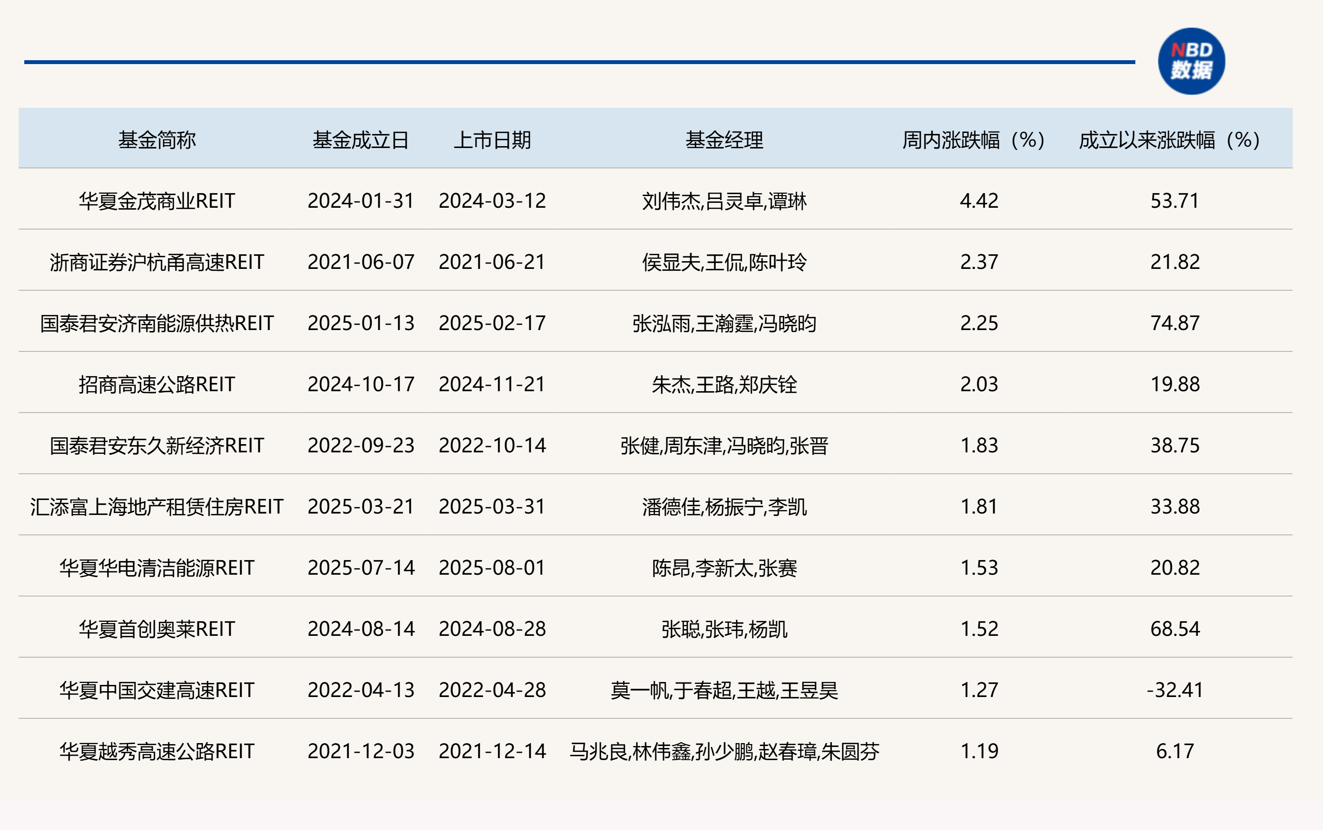 單只產(chǎn)品方面,已上市的77只公募REITs產(chǎn)品中,環(huán)比上漲的為33只。漲幅最大的三只產(chǎn)品為華夏金茂商業(yè)REIT、浙商證券滬杭甬高速REIT和國泰君安濟(jì)南能源供熱REIT,周內(nèi)分別上漲4.42%、2.37%和2.25%。