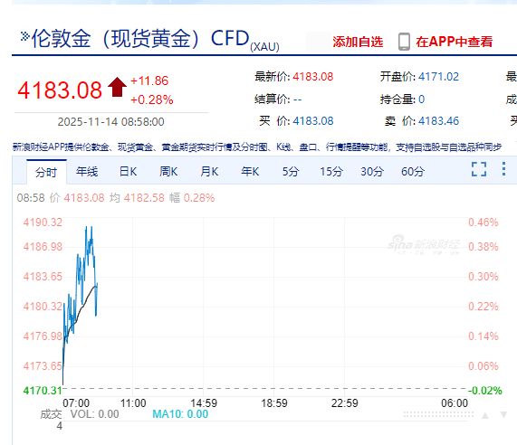 截至11月14日發(fā)稿,現(xiàn)貨黃金報(bào)4183.08美元/盎司,紐約黃金報(bào)4188.1美元/盎司。