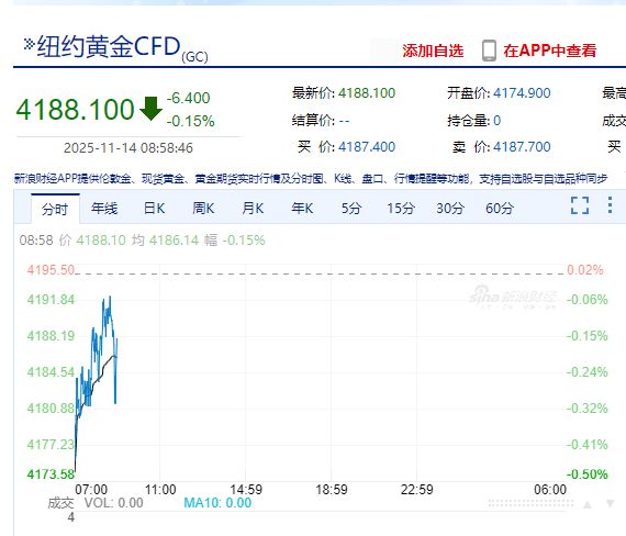 北京時(shí)間2025年11月14日周五,黃金價(jià)格維持在4180美元附近震蕩。