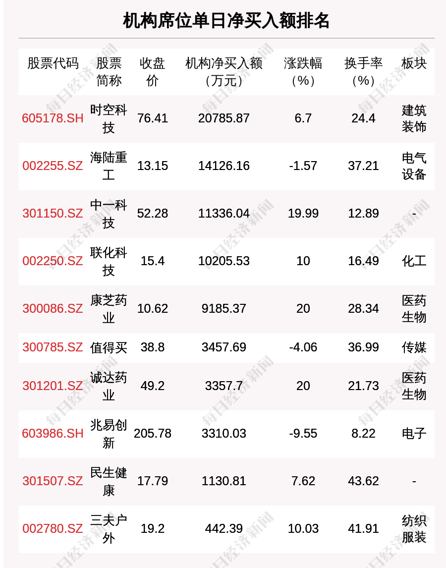 在龍虎榜中,涉及機(jī)構(gòu)專用席位的個(gè)股有25只,凈買入額前三的是時(shí)空科技、海陸重工、中一科技,分別為2.08億元、1.41億元、1.13億元。