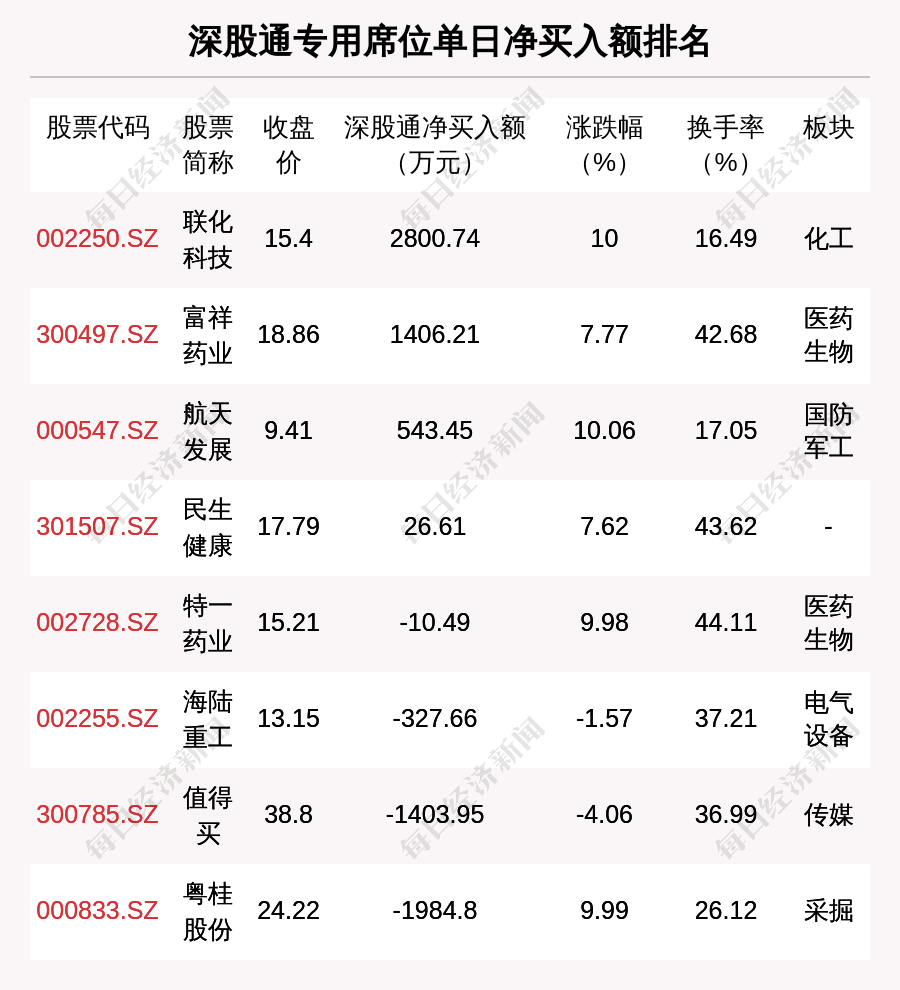 在龍虎榜中,涉及深股通專用席位的個(gè)股有8只,聯(lián)化科技的深股通專用席位凈買入額最大,凈買入2800.74萬(wàn)元。