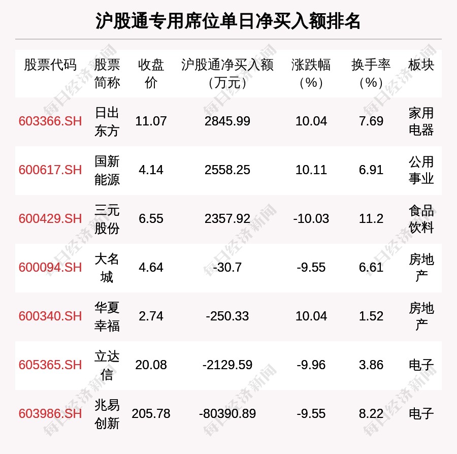 在龍虎榜中,涉及滬股通專用席位的個(gè)股有7只,日出東方的滬股通專用席位凈買入額最大,凈買入2845.99萬(wàn)元。
