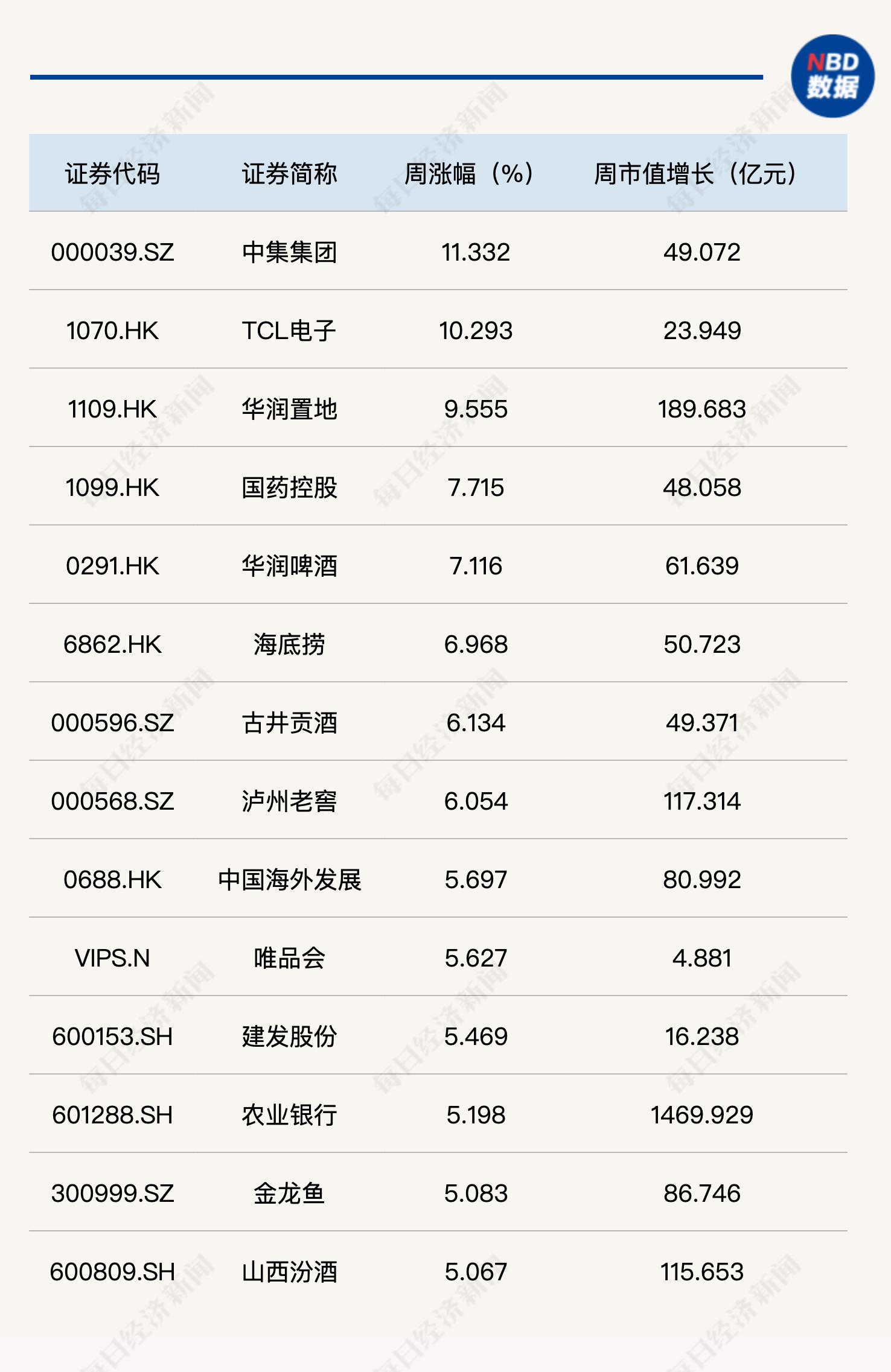 成分股表現(xiàn)方面,中集集團、TCL電子本周漲幅均超過10%;華潤置地、國藥控股、華潤啤酒、海底撈、古井貢酒等12只個股周漲幅也超過5%。市值增長方面,農(nóng)業(yè)銀行本周市值增長1469.93億元;工商銀行、騰訊控股以及中國銀行的周市值增長也在500億元以上。