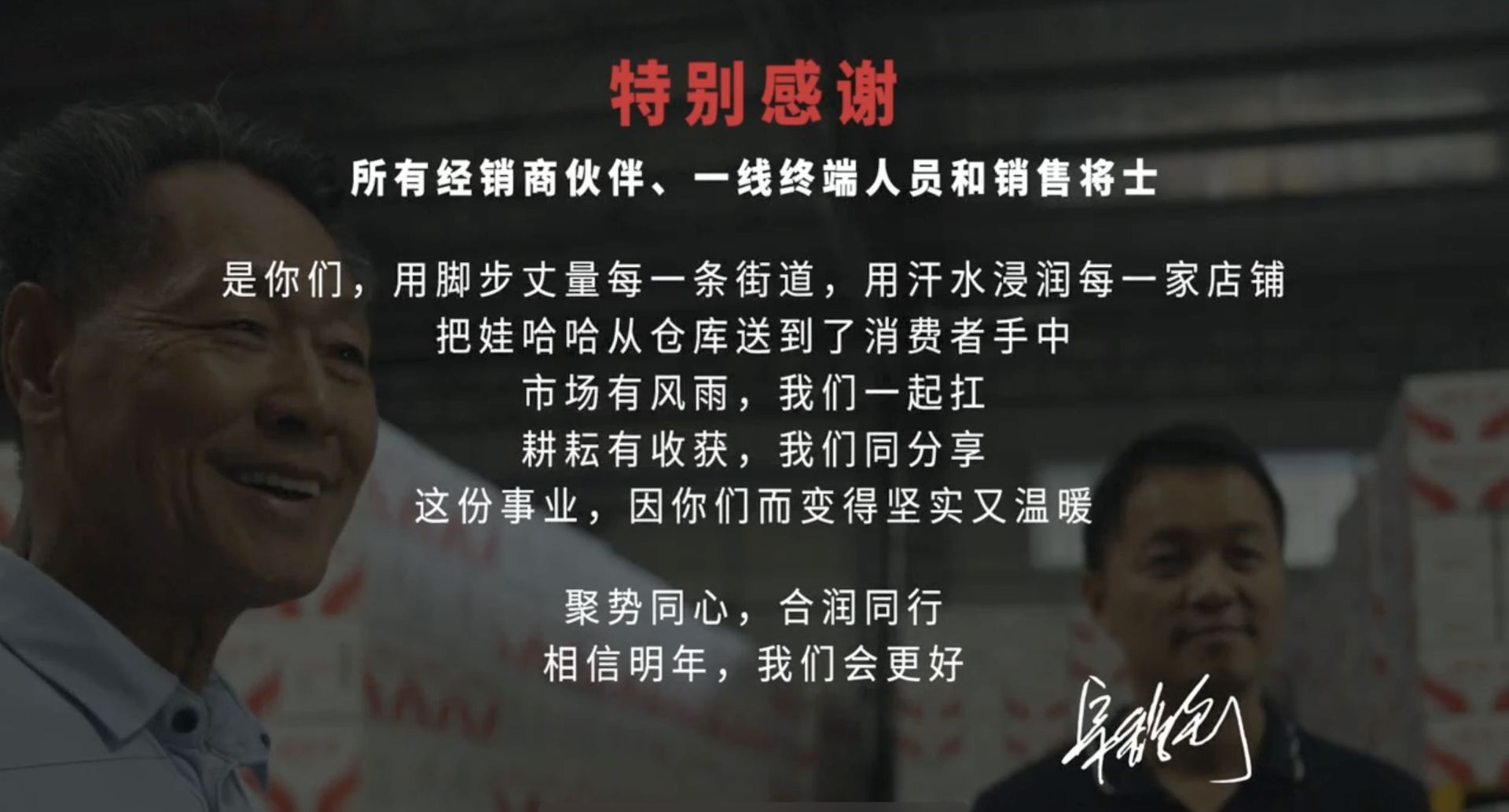 然而,這次以宏勝名義通知的娃哈哈經(jīng)銷商大會(huì),在娃哈哈官方渠道沒(méi)有任何消息,而是在宏勝集團(tuán)的官方微信號(hào)上進(jìn)行宣傳,線下缺席的宗馥莉,最終在大會(huì)紀(jì)錄片《我們還是我們,我們不止我們》末尾留下了一段針對(duì)經(jīng)銷商伙伴和一線終端人員的“特別感謝”。