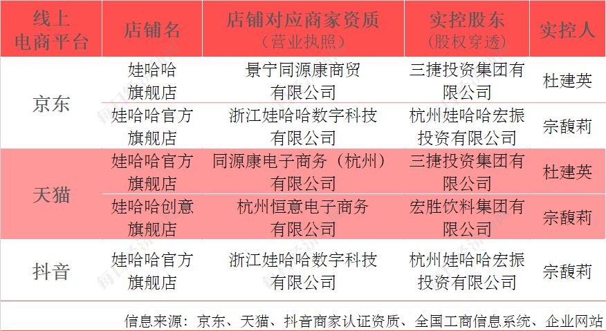 目前,天貓、京東、抖音平臺(tái)上娃哈哈的官方店鋪均統(tǒng)一為“娃哈哈官方旗艦店”,其官方旗艦店對(duì)應(yīng)的商家資質(zhì)統(tǒng)一為杭州恒意電子商務(wù)有限公司,股權(quán)穿透后的實(shí)控股東為宏勝飲料集團(tuán)有限公司,實(shí)控人為宗馥莉。