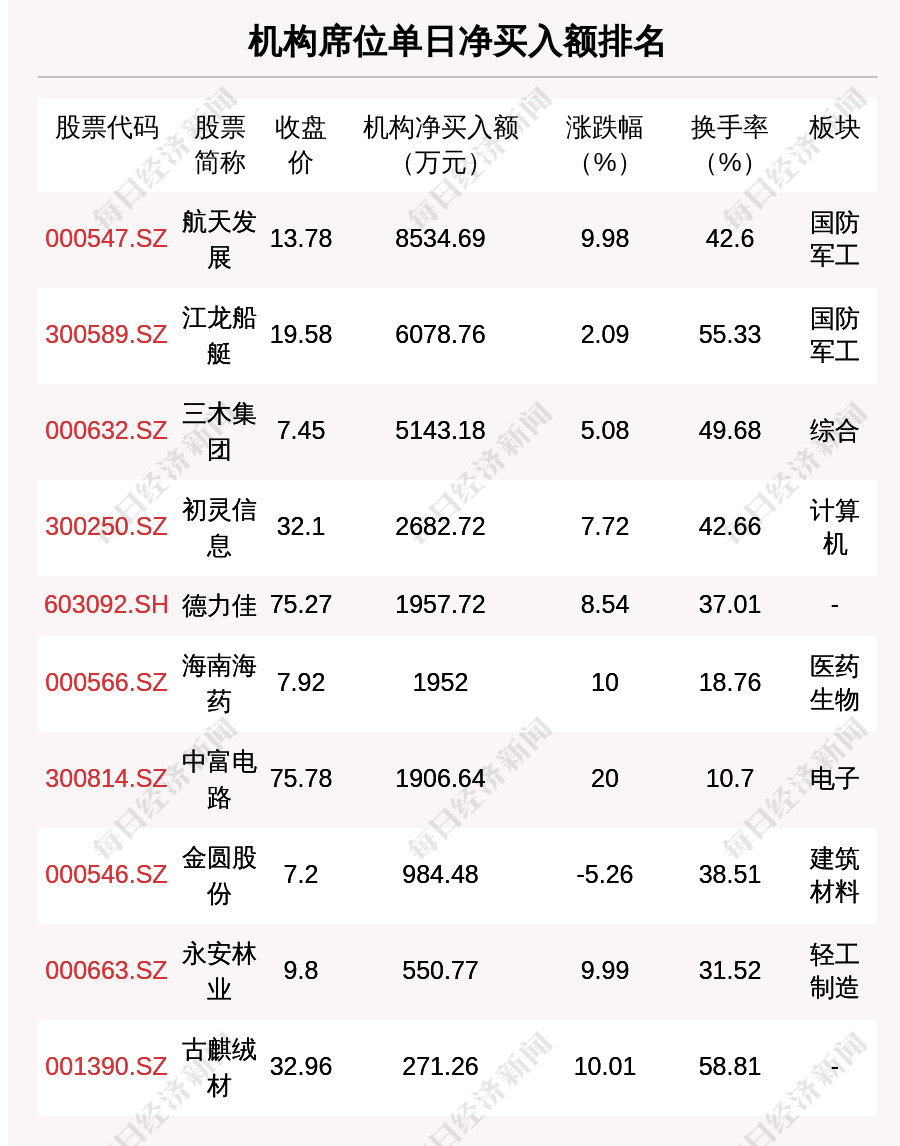 在龍虎榜中,涉及機構專用席位的個股有22只,凈買入額前三的是航天發(fā)展、江龍船艇、三木集團,分別為8534.69萬元、6078.76萬元、5143.18萬元。
