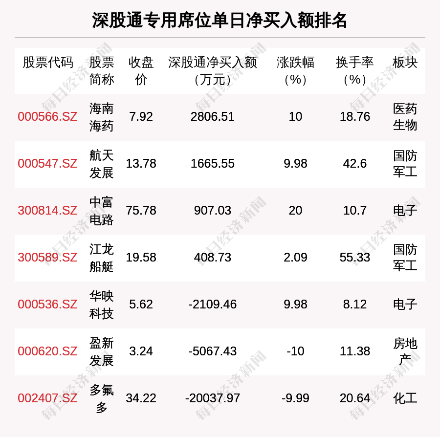 在龍虎榜中,涉及深股通專用席位的個股有7只,海南海藥的深股通專用席位凈買入額最大,凈買入2806.51萬元。