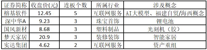 從連板情況來(lái)看,今日首板個(gè)股有17只;2連板的個(gè)股有3只;3連板及以上的個(gè)股有4只。今日連板數(shù)排名前5的個(gè)股包括榕基軟件、深中華A、國(guó)風(fēng)新材、夢(mèng)天家居、實(shí)達(dá)集團(tuán),具體如下表所示。
