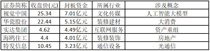 從封板資金來(lái)看,今日漲停板個(gè)股中,封板資金排名前5的個(gè)股包括視覺(jué)中國(guó)、華瓷股份、實(shí)達(dá)集團(tuán)、海鷗住工、特發(fā)信息。歡迎大家關(guān)注微信公眾號(hào)“道達(dá)號(hào)”,其“道達(dá)漲停復(fù)盤(pán)”欄目為大家解讀。