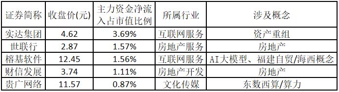 主力資金凈流入金額占市值比例排名前5的個(gè)股分別為實(shí)達(dá)集團(tuán)、世聯(lián)行、榕基軟件、財(cái)信發(fā)展、貴廣網(wǎng)絡(luò)。