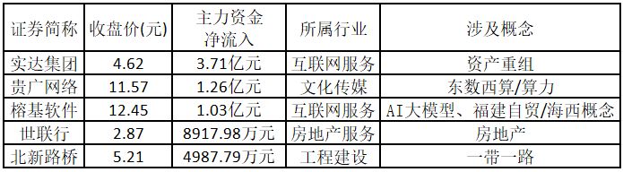 從主力資金來(lái)看,今日漲停板個(gè)股中,主力資金凈流入金額排名前5的個(gè)股分別為實(shí)達(dá)集團(tuán)、貴廣網(wǎng)絡(luò)、榕基軟件、世聯(lián)行、北新路橋。