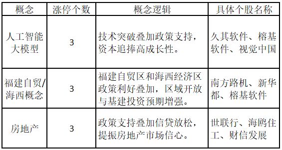 從概念特征來(lái)看,今日漲停板個(gè)股中,人工智能大模型、福建自貿(mào)/海西概念、房地產(chǎn)概念的個(gè)股最多。