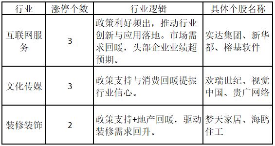 從行業(yè)特征來(lái)看,今日漲停板個(gè)股中,互聯(lián)網(wǎng)服務(wù)、文化傳媒、裝修裝飾行業(yè)的個(gè)股最多。
