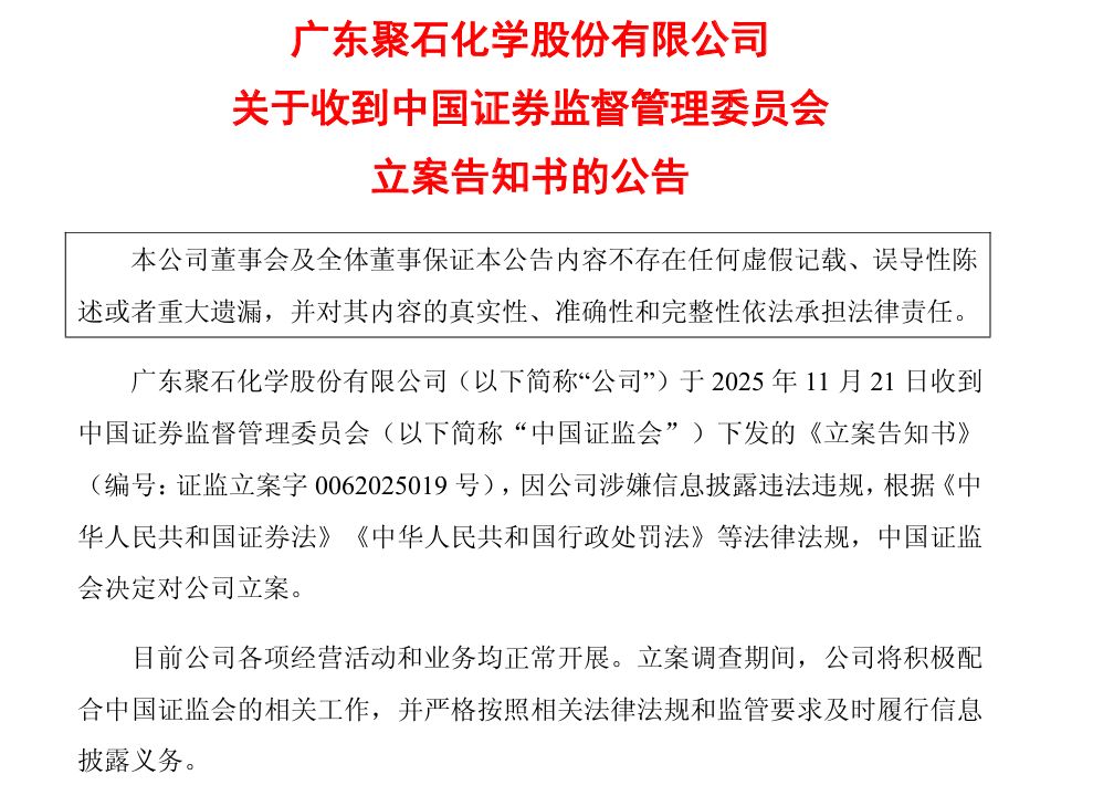 11月21日晚,聚石化學(xué)晚間公告,公司于2025年11月21日收到中國證券監(jiān)督管理委員會(簡稱“中國證監(jiān)會”)下發(fā)的《立案告知書》,因公司涉嫌信息披露違法違規(guī),根據(jù)《中華人民共和國證券法》《中華人民共和國行政處罰法》等法律法規(guī),中國證監(jiān)會決定對公司立案。