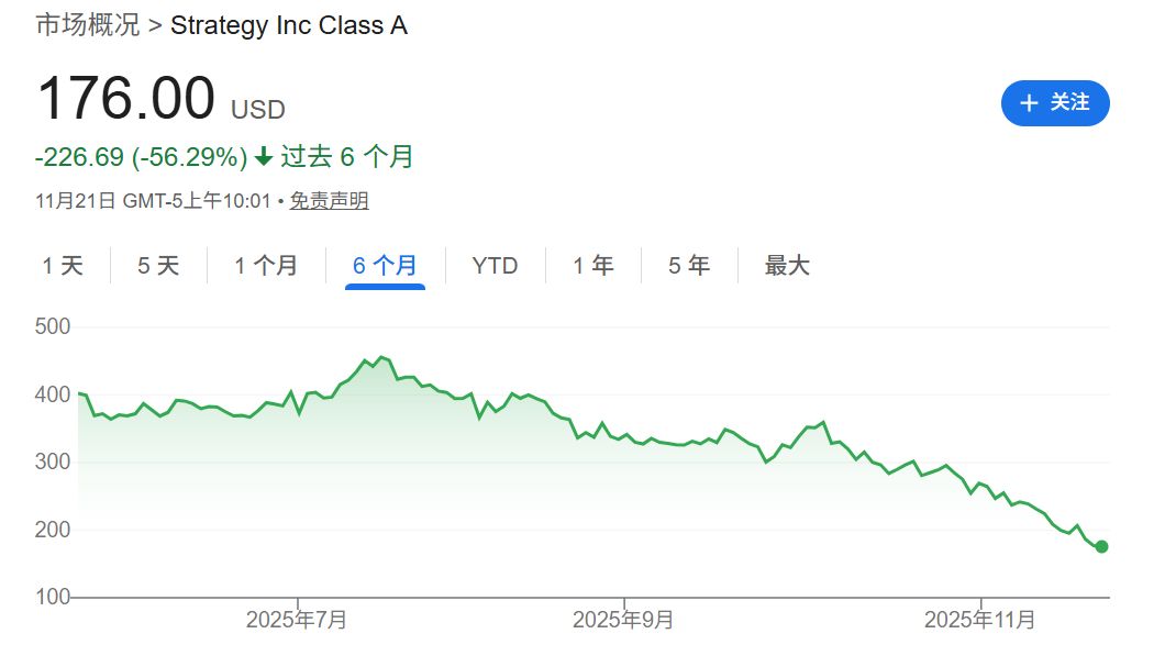 截至發(fā)稿,全球最大比特幣企業(yè)持有者Strategy公司(原為MicroStrategy,于今年2月更名)股價盤前跌近5%。自2024年11月創(chuàng)下歷史高點以來,該股股價已大跌67%,過去六個月累計下跌逾56%。