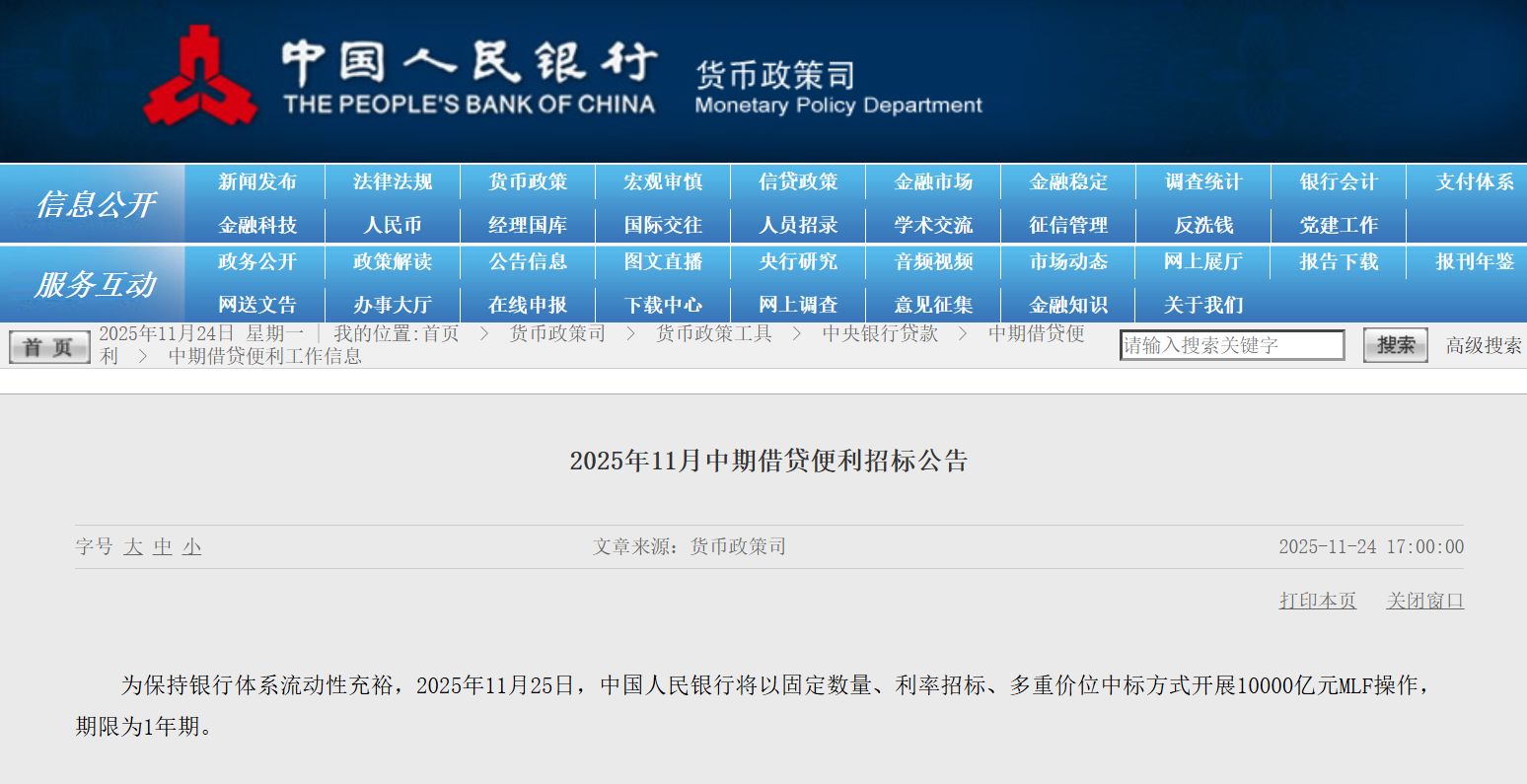 11月24日,央行公告,為保持銀行體系流動(dòng)性充裕,2025年11月25日,中國(guó)人民銀行將以固定數(shù)量、利率招標(biāo)、多重價(jià)位中標(biāo)方式開展10000億元MLF操作,期限為1年期。