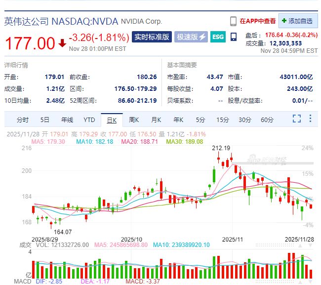 英偉達(dá)報(bào)177美元,跌1.81%,市值蒸發(fā)792億美元(約合人民幣5604億元)。