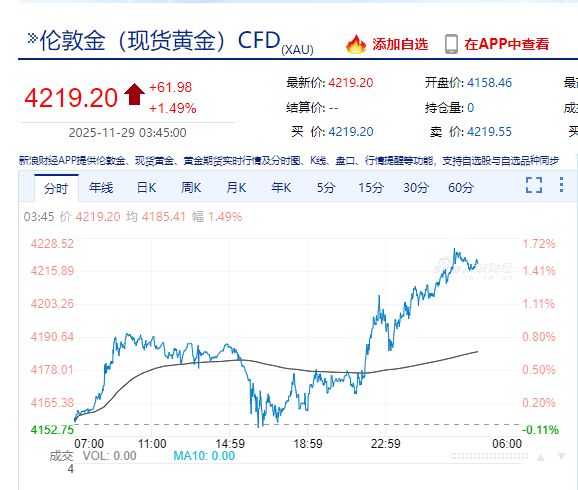 現(xiàn)貨黃金報(bào)4219.20美元/盎司,日內(nèi)漲1.49%。
