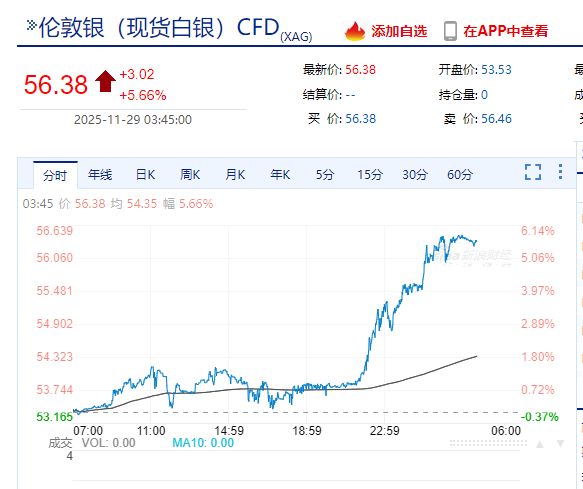 現(xiàn)貨白銀報(bào)56.38美元/盎司,日內(nèi)上漲5.66%,創(chuàng)歷史新高。