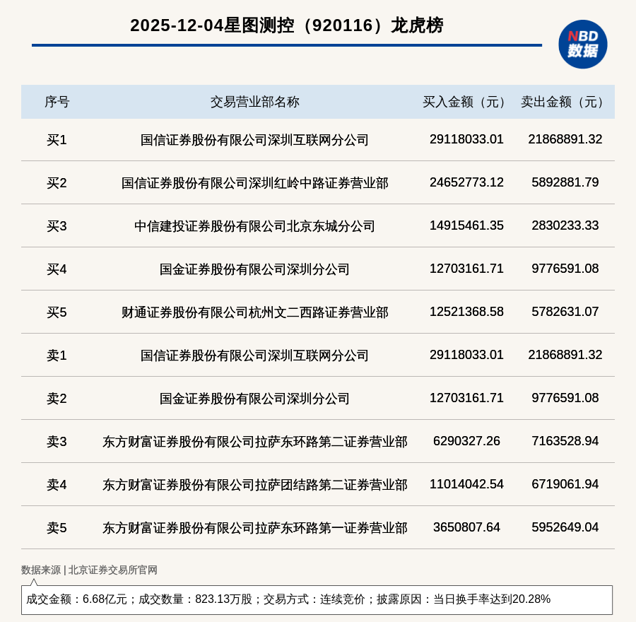 每經(jīng)訊,2025年12月4日,北交所上市公司星圖測控(920116,收盤價:82.3元)登上龍虎榜,交易方式是連續(xù)競價,披露原因是當日換手率達到20.28%,成交數(shù)量823.13萬股,成交金額6.68億元。買一席位為國信證券股份有限公司深圳互聯(lián)網(wǎng)分公司,買入2911.8萬元;賣一席位為國信證券股份有限公司深圳互聯(lián)網(wǎng)分公司,賣出2186.89萬元。