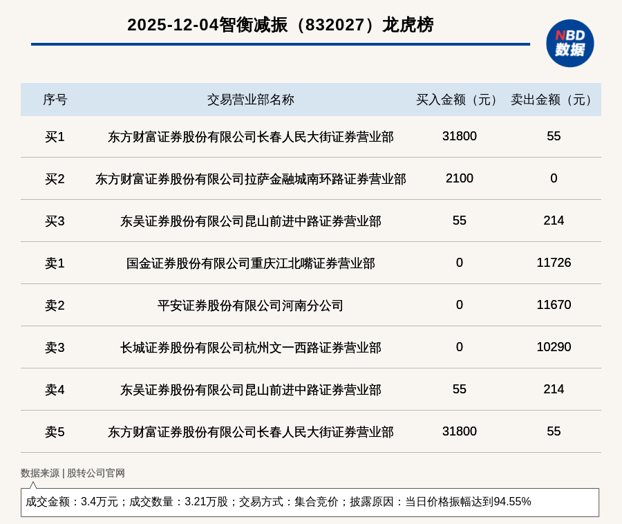 每經(jīng)訊,2025年12月4日,新三板基礎(chǔ)層公司智衡減振(832027,收盤(pán)價(jià):1.05元)登上龍虎榜,交易方式是集合競(jìng)價(jià),披露原因是當(dāng)日價(jià)格振幅達(dá)到94.55%,成交數(shù)量3.21萬(wàn)股,成交金額3.4萬(wàn)元。買(mǎi)一席位為東方財(cái)富證券股份有限公司長(zhǎng)春人民大街證券營(yíng)業(yè)部,買(mǎi)入3.18萬(wàn)元;賣(mài)一席位為國(guó)金證券股份有限公司重慶江北嘴證券營(yíng)業(yè)部,賣(mài)出1.17萬(wàn)元。