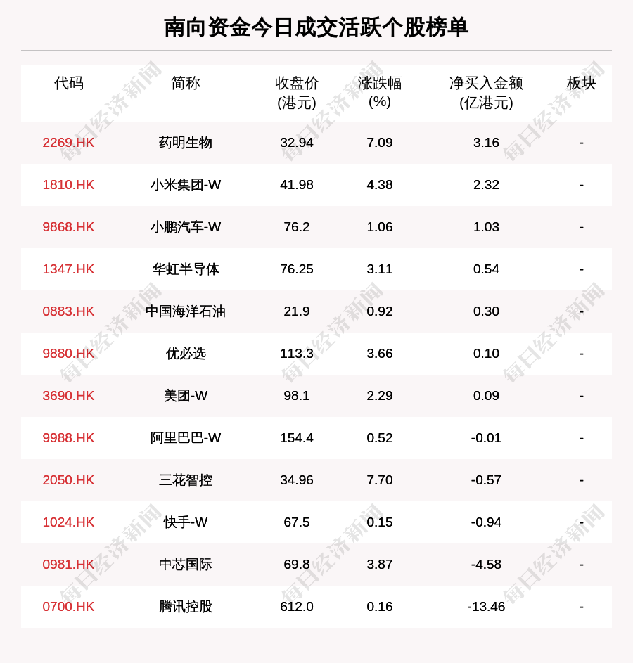 南向資金成交活躍個股榜單中,凈買入個股共7只,金額最多的是藥明生物(2269.HK,收盤價:32.94港元),凈買入3.156億港元;凈賣出個股共5只,金額最多的是騰訊控股(0700.HK,收盤價:612.0港元),凈賣出13.459億港元。