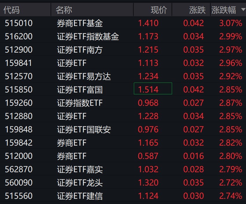 受盤面影響,證券相關(guān)ETF漲約3%。