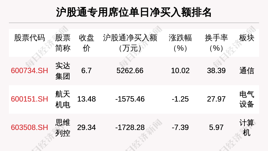 在龍虎榜中,涉及滬股通專用席位的個股有3只,實達(dá)集團的滬股通專用席位凈買入額最大,凈買入5262.66萬元。