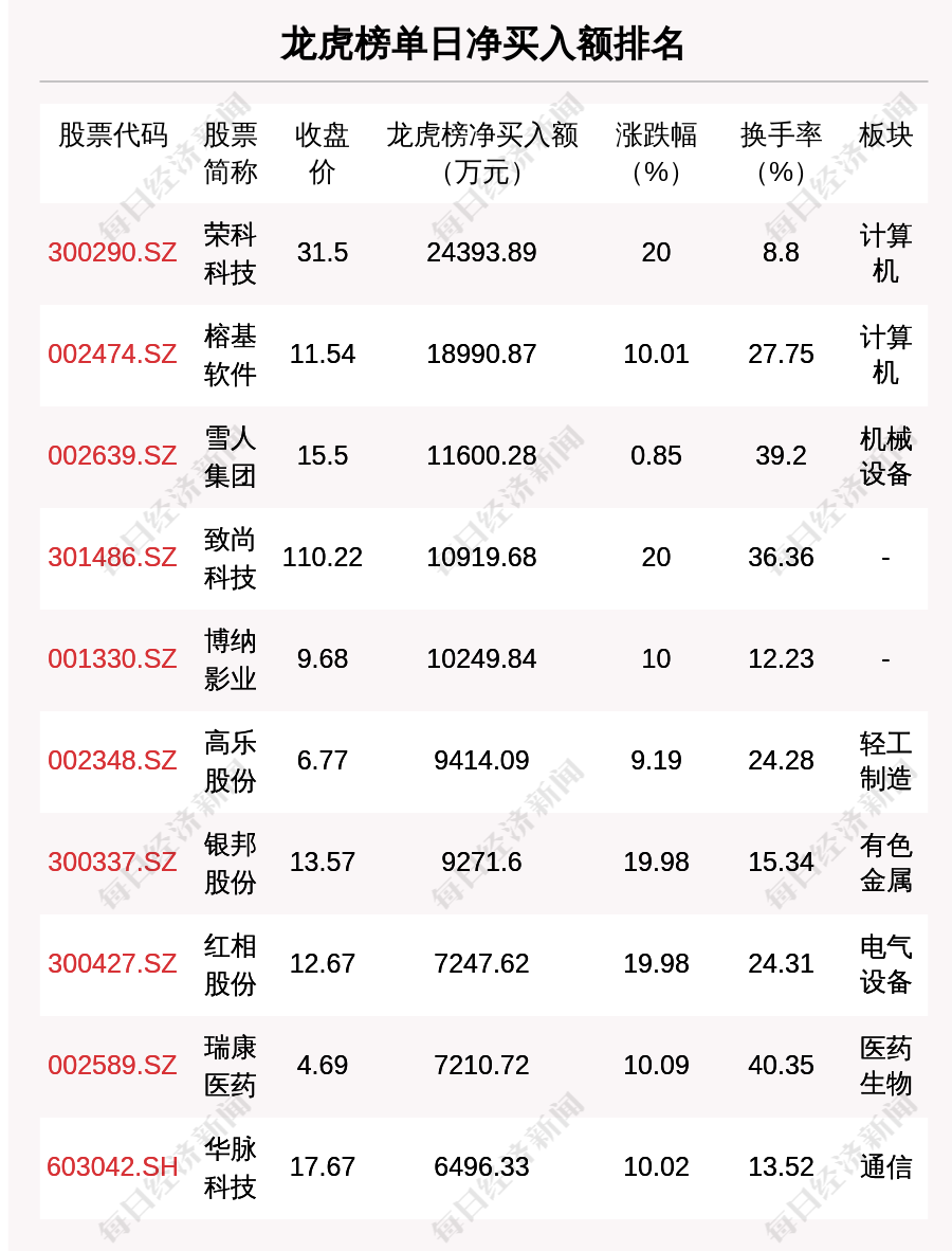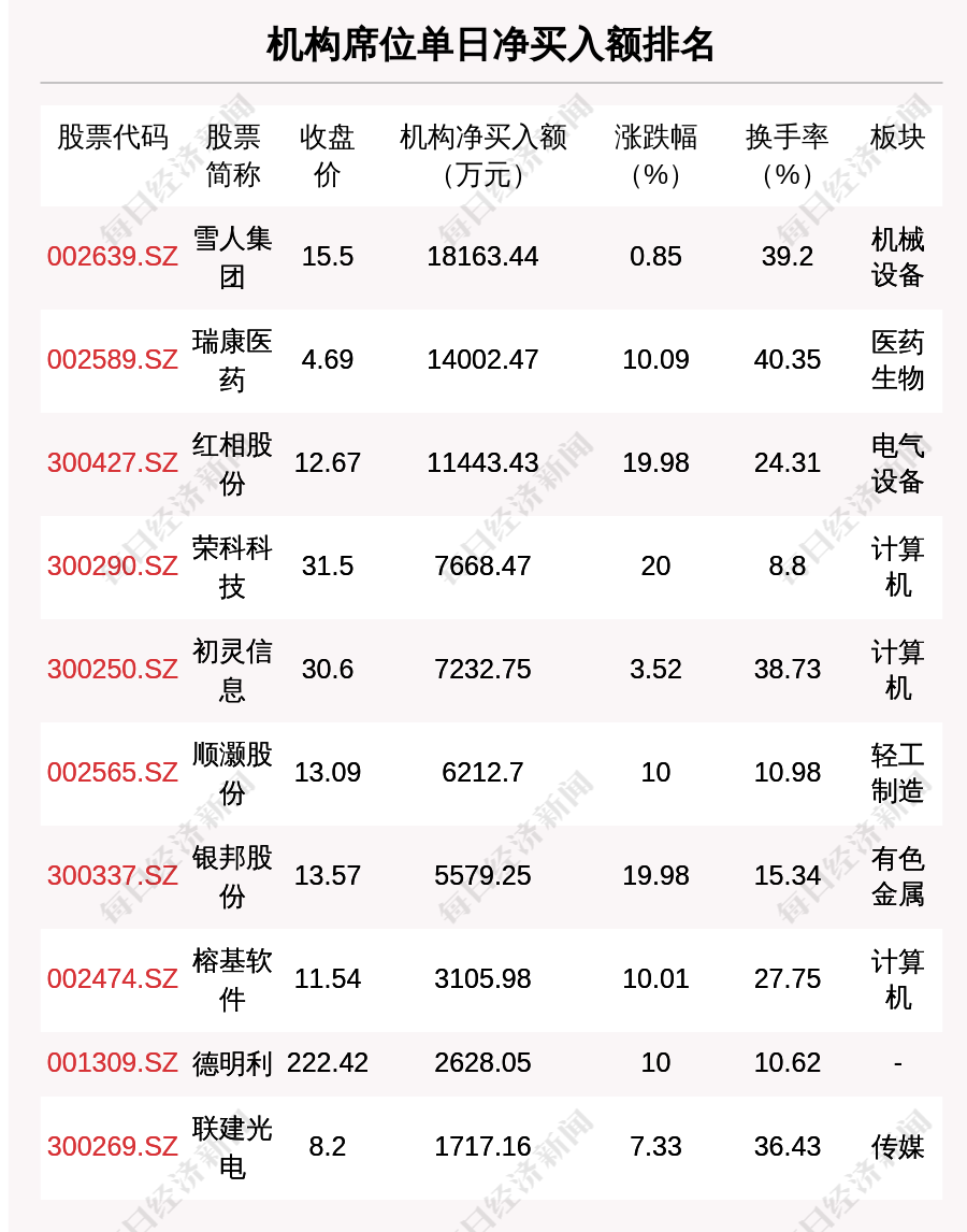 在龍虎榜中,涉及機構(gòu)專用席位的個股有27只,凈買入額前三的是雪人集團、瑞康醫(yī)藥、紅相股份,分別為1.82億元、1.4億元、1.14億元。