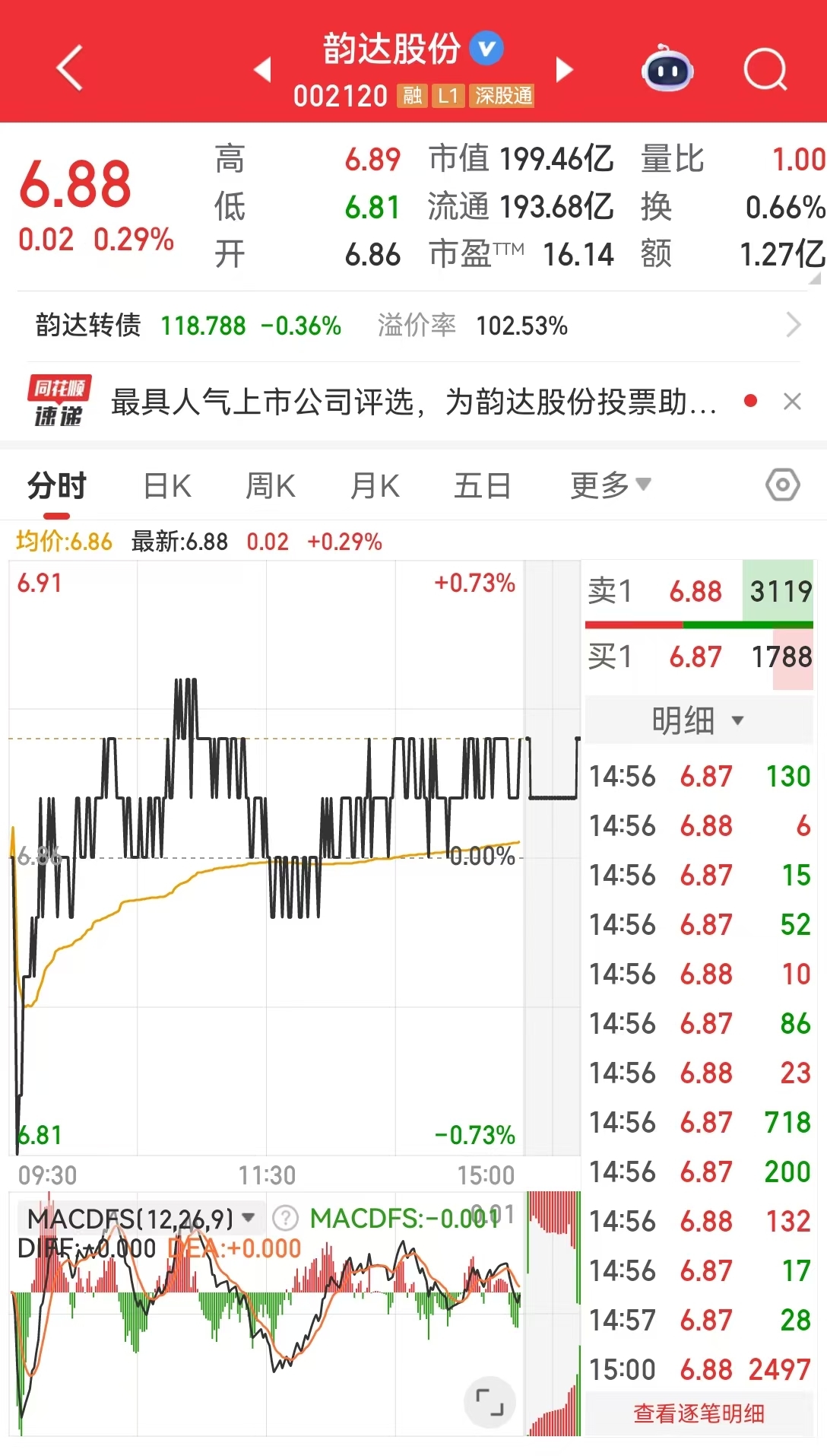 截至12月12日收盤(pán),韻達(dá)股份報(bào)6.88元,市值199.46億元。