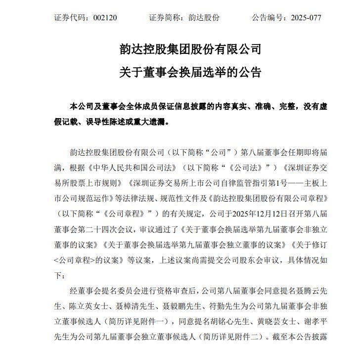 12月13日,韻達(dá)股份(SZ002120)發(fā)布關(guān)于董事會(huì)換屆選舉的公告。