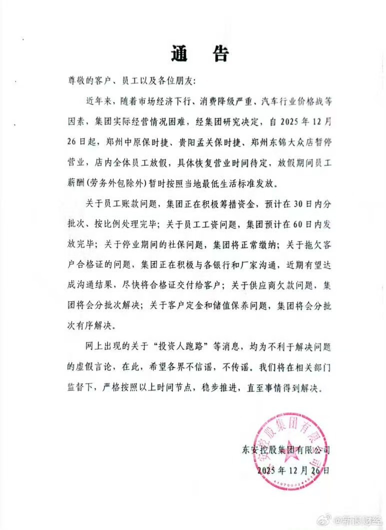 “近年來(lái),集團(tuán)實(shí)際經(jīng)營(yíng)情況困難,經(jīng)集團(tuán)研究決定,自2025年12月26日起,鄭州中原保時(shí)捷、貴陽(yáng)孟關(guān)保時(shí)捷、鄭州東錦大眾店暫停營(yíng)業(yè),店內(nèi)全體員工放假,具體恢復(fù)營(yíng)業(yè)時(shí)間待定。放假期間,員工薪酬(勞務(wù)外包除外)暫時(shí)按照當(dāng)?shù)刈畹蜕顦?biāo)準(zhǔn)發(fā)放。”12月26日,東安控股集團(tuán)對(duì)旗下鄭州中原保時(shí)捷中心近期疑閉店“跑路”一事進(jìn)行回應(yīng)。