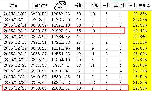 上一次市場成交額突破2萬億元是12月12日,當(dāng)天的首板進階率為43.48%,那是因為12月11日的首板公司只有23家,基數(shù)偏小導(dǎo)致首板進階率偏大。