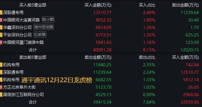 12月22日,中國銀河證券大連黃河路買入通宇通訊9052萬元,通宇通訊股價漲停。