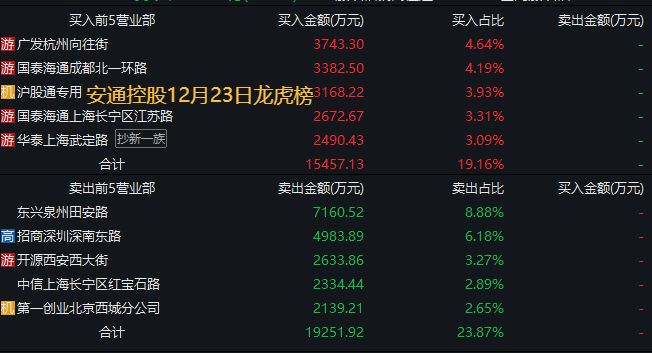 在本周的交易中,該席位在12月23日買入安通控股2672萬元之后,當(dāng)日安通控股漲停,12月24日-25日公司股價繼續(xù)漲停。12月26日安通控股繼續(xù)漲停,但是從12月26日的龍虎榜數(shù)據(jù)來看,國泰海通證券上海長寧區(qū)江蘇路營業(yè)部還是沒有現(xiàn)身賣出席位中。