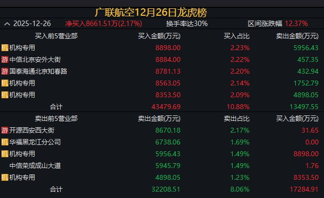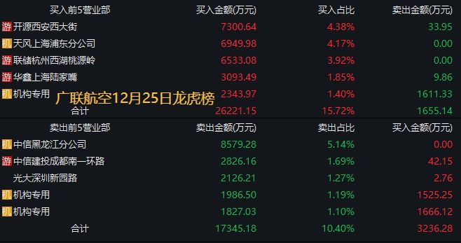 廣聯(lián)航空12月25日的龍虎榜數(shù)據(jù)顯示,開源證券西安西大街買入7300萬元,次日該席位賣出8670萬元,很顯然拿了一個漲停板的利潤出局。