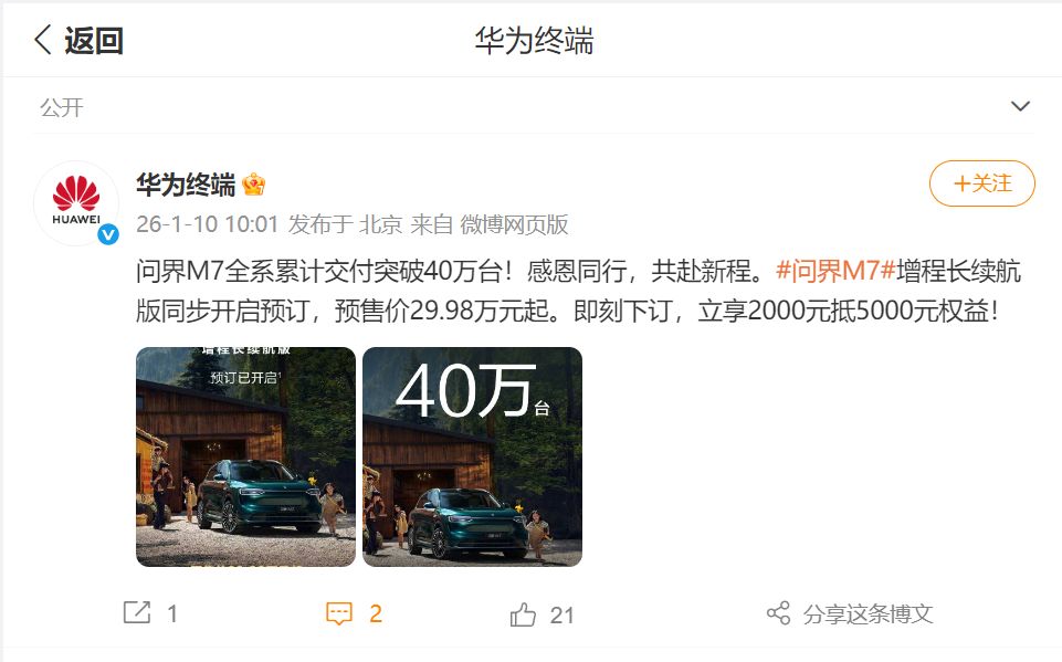 據(jù)華為終端官方微博1月10日消息,問界M7全系累計(jì)交付突破40萬臺(tái)!問界M7增程長續(xù)航版同步開啟預(yù)訂,預(yù)售價(jià)29.98萬元起。即刻下訂,立享2000元抵5000元權(quán)益!