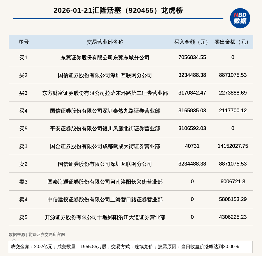 每經(jīng)訊,2026年1月21日,北交所上市公司匯隆活塞(920455,收盤價:10.5元)登上龍虎榜,交易方式是連續(xù)競價,披露原因是當(dāng)日收盤價漲幅達到20.00%,成交數(shù)量1955.85萬股,成交金額2.02億元。買一席位為東莞證券股份有限公司東莞東城分公司,買入705.68萬元;賣一席位為國金證券股份有限公司成都武成大街證券營業(yè)部,賣出1415.2萬元。