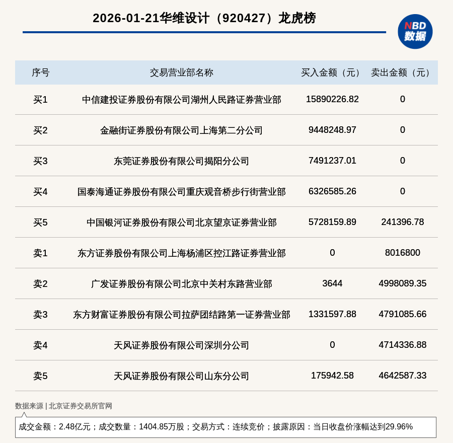 每經(jīng)訊,2026年1月21日,北交所上市公司華維設(shè)計(920427,收盤價:18.22元)登上龍虎榜,交易方式是連續(xù)競價,披露原因是當日收盤價漲幅達到29.96%,成交數(shù)量1404.85萬股,成交金額2.48億元。買一席位為中信建投證券股份有限公司湖州人民路證券營業(yè)部,買入1589.02萬元;賣一席位為東方證券股份有限公司上海楊浦區(qū)控江路證券營業(yè)部,賣出801.68萬元。