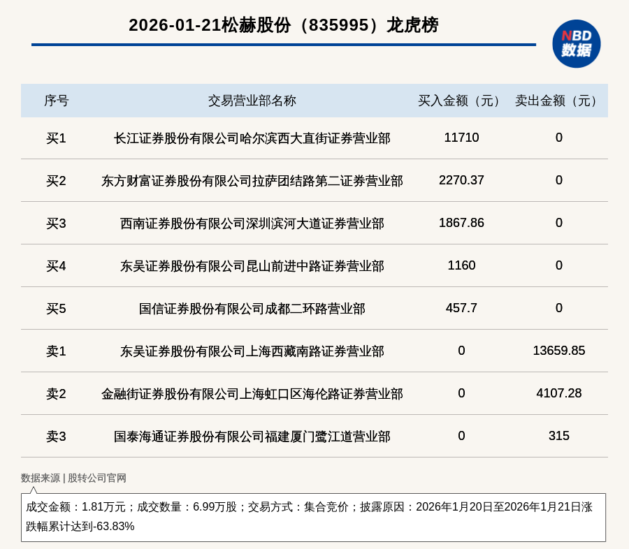 每經(jīng)訊,2026年1月21日,新三板創(chuàng)新層公司松赫股份(835995,收盤價:0.17元)登上龍虎榜,交易方式是集合競價,披露原因是2026年1月20日至2026年1月21日漲跌幅累計達(dá)到-63.83%,成交數(shù)量6.99萬股,成交金額1.81萬元。買一席位為長江證券股份有限公司哈爾濱西大直街證券營業(yè)部,買入1.17萬元;賣一席位為東吳證券股份有限公司上海西藏南路證券營業(yè)部,賣出1.37萬元。