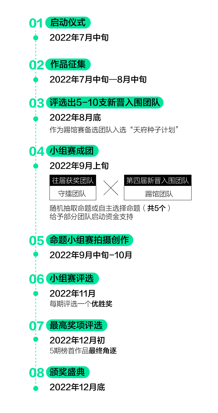 為鼓勵(lì)視頻創(chuàng)作,2022年將繼續(xù)啟動(dòng)“天府種子計(jì)劃”,高標(biāo)準(zhǔn)、高質(zhì)量生產(chǎn)以成都為主題/背景的影像IP。該計(jì)劃將通過“揭榜掛帥”的模式,發(fā)布5-10個(gè)提供啟動(dòng)資金的“種子”項(xiàng)目,通過邀請(qǐng)社會(huì)報(bào)名、機(jī)構(gòu)推薦的形式,征集評(píng)選出視頻行業(yè)有潛力的承接團(tuán)隊(duì)、個(gè)人。主辦方將組織專業(yè)評(píng)審對(duì)入圍團(tuán)隊(duì)/個(gè)人遞交的資料進(jìn)行評(píng)議打分,選出各個(gè)“種子”項(xiàng)目的承接方并予以執(zhí)行。